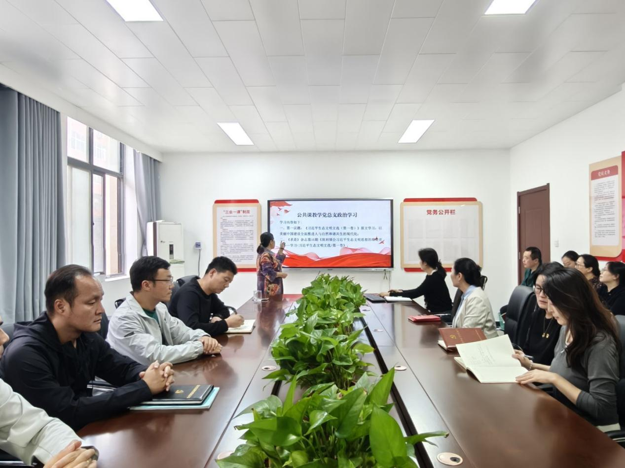 会上,黄绿欣首先领学了《习近平生态文明文选(第一卷)》:美丽中国建设全面推进人与自然和谐共生的现代化,她指出,习近平生态文明思想蕴含着对全人类生存和发展的深切关怀,体现了坚持为人民谋幸福、为民族谋复兴、为人类谋进步、为世界谋大同的崇高境界。各位老师要将这种胸怀天下、放眼未来的宏阔视野融入课程中去,加强课程思政建设,讲好高质量发展和高水平保护同频共振的中国故事。